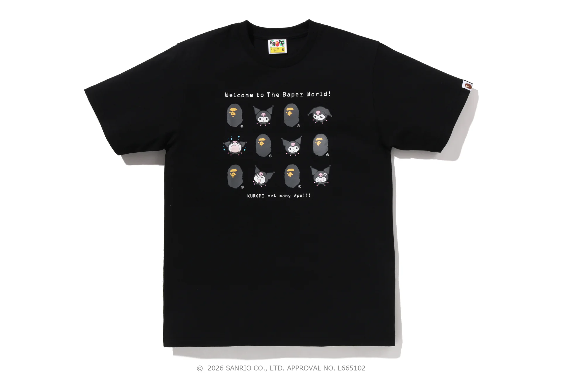 The BAPE® X KUROMI TEE uses the brand’s “Welcome to The Bape® World!” graphic as a base. Kuromi appears alongside the APE HEAD logo, while BAPE®’s MAD FACE graphic sits in the upper corner. A Kuromi tail graphic finishes the back.